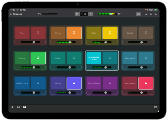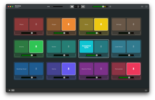 Scenes, Patches and Projects: Sessions contains twelve Scenes that are easily identified by a bold color and a name or icon. Each Scene has its own Mixer so you can build twelve totally independent combinations of instruments and effects.