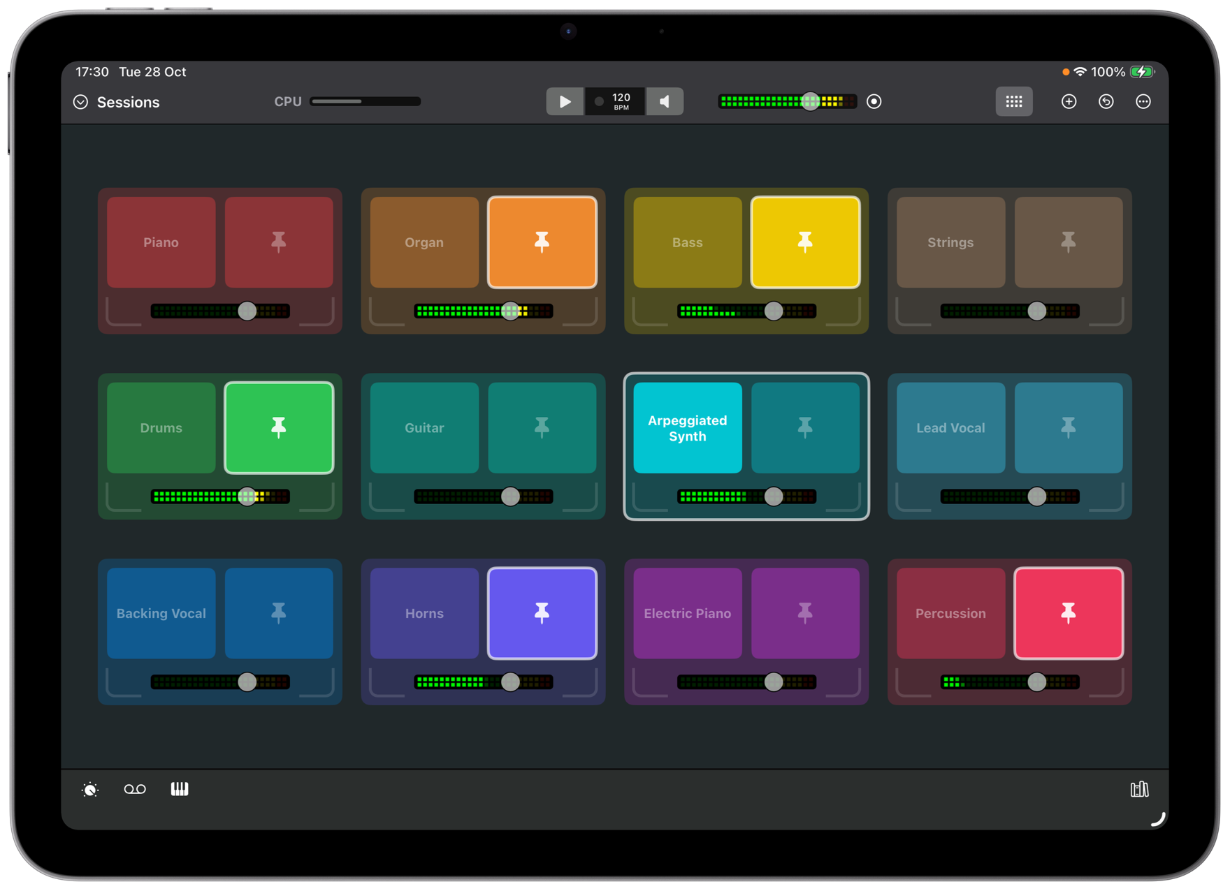 Sessions contains twelve Scenes that are easily identified by a bold color and a name or icon. Each Scene has its own Mixer so you can build twelve totally independent combinations of instruments and effects.